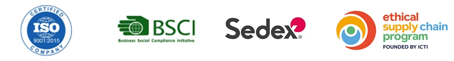 - We have obtained ISO 9001, BSCI, SEDEX, and ICTI certifications, demonstrating our commitment to quality and social responsibility.